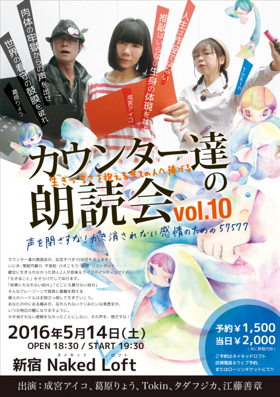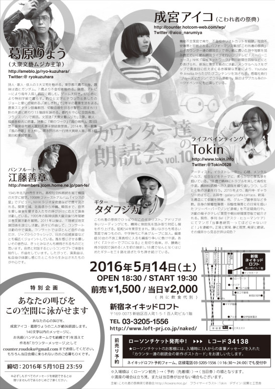 あなたの心の叫びを当日のライブ中、成宮アイコ・ 葛原りょうの二人が絶叫朗読します。 140文字以内のメッセージとお名前( ハンドルネームでも結構です)を添えて件名を「 カウンターメッセージ」として counter.roudoku★gmail.com(★を@ に変換してください) まで送信してください。 もちろん当日会場に来られない方のご応募もOKです。