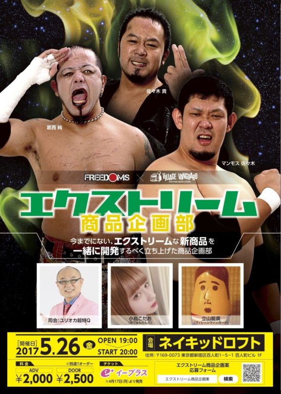 SCHEDULE 2017 05 26 Friday FREEDOMS×ヴィレッジヴァンガード presents エクストリーム商品企画部 OPEN 19:00 - START 20:00 Tweet 【出演】佐々木貴、葛西純、マンモス佐々木、小鳥こたお(あヴぁんだんど)、立山龍廣(ヴィレッジヴァンガード) 【司会】ユリオカ超特Q TICKET前売¥2000 / 当日¥2500(税込・要1オーダー¥500以上) ※前売券はe+にて4月17日(月)12:00より発売予定! Share