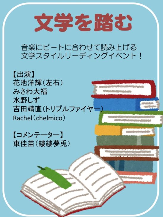 SCHEDULE 2017 07 24 Monday 文学を踏む OPEN 18:30 - START 19:30 Tweet 音楽にビートに合わせて読み上げる 文学スタイルリーディングイベント! 【出演】 花池洋輝(左右) みさわ大福 水野しず 吉田靖直(トリプルファイヤー) Rachel(chelmico) 【コメンテーター】 東佳苗(縷縷夢兎) 【司会】 エマ渡辺 <50音順> TICKET前売¥2300 / 当日¥2600 ※要1オーダー(¥500以上) 前売はe+にて6月26 日(月)12:00より発売開始! Share