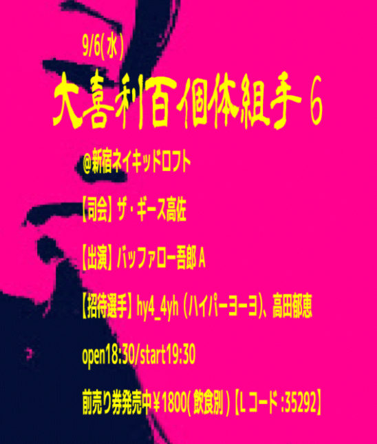SCHEDULE 2017 09 06 Wednesday 「大喜利百個体組手6」 OPEN 18:30 - START 19:30 Tweet 【司会】ザ・ギース高佐 【出演】バッファロー吾郎 【招待選手】hy4_4yh(ハイパーヨーヨ)、高田郁恵 TICKET前売¥1800(飲食別)※要1オーダー¥500以上 ※前売り券はローソンチケットにて8/15より発売!!【Lコード:35292】 Share