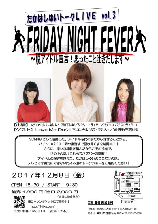 SDN48 として活動した、アイドル時代の今だから話せることから、 パチンコパチスロ界の裏話まで語り尽くす2時間半!! さらに、様々な経験を積んだからこその視点で、 世の中のあれこれもズバズバ一刀両断! アイドルの限界を越えた、たかはしゆいのここだけの話。 テレビでは絶対にできない門外不出のトークショーをご堪能ください!