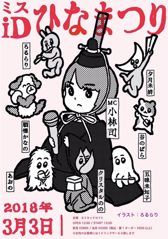 SCHEDULE 2018 03 03 Saturday DAY EVENT ミスiDひな祭り OPEN 12:00 - START 13:00 Tweet 【出演】 あおの クリスタルのの 五味未知子 戦慄かなの 谷のばら 夕月未終 ろるらり 【MC】小林司 三月三日はひな祭り。みんなで歌歌ったりお菓子食べたり。女性のお客様のみワンドリンクサービス。 TICKET前売¥2800 / 当日¥3300(税込・要1オーダー¥500以上) 前売はe+にて2/15(木)12:00より発売開始! ※女性のお客様には1ドリンクサービス! Share