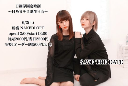 SCHEDULE 2018 06 02 Saturday DAY EVENT 日翔学園定時制 ~日乃まそら誕生日会〜 OPEN 12:00 - START 13:00 Tweet 【出演】SHO-NO、日乃まそら TICKET前売¥2000 / 当日¥2500 ※要1オーダー(¥500以上) 前売券は4/21(土)正午12時よりe+にて発売! Share