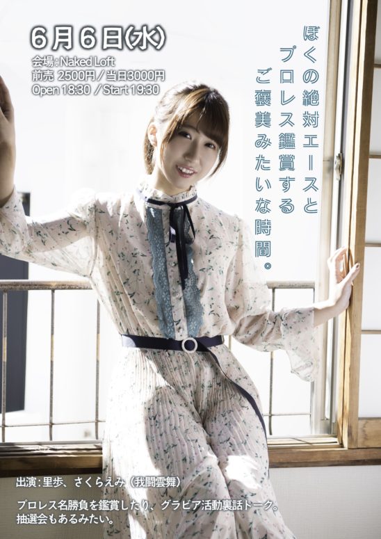 SCHEDULE 2018 06 06 Wednesday 「ぼくの絶対エースとプロレス鑑賞するご褒美みたいな時間。」 OPEN 18:30 - START 19:30 Tweet 【出演】里歩、さくらえみ(我闘雲舞) 【ゲスト】清野茂樹(フリーアナウンサー) TICKET前売¥3000 / 当日¥3500(要1オーダー¥500以上) 前売はe+にて4/28(土)12:00より発売開始 Share