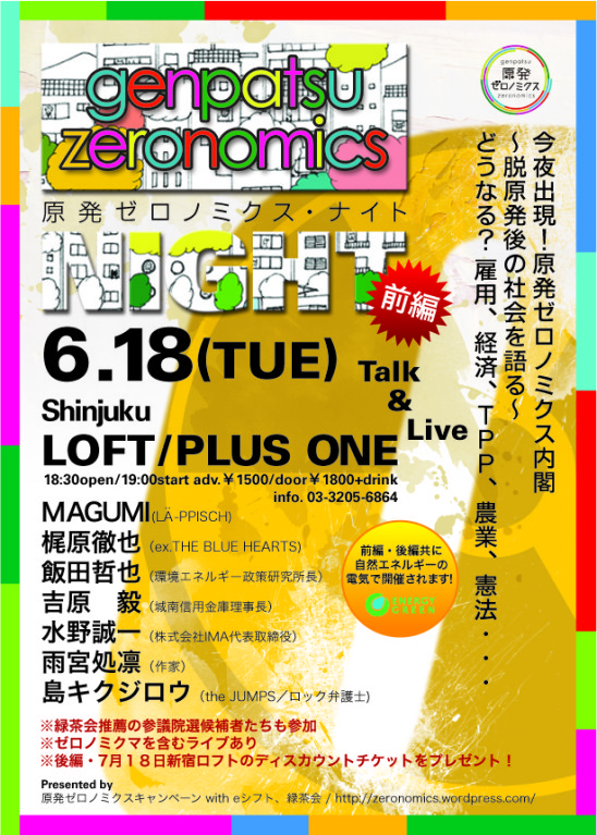 イデオロギーでも危険性でもない、単純にどんなエネルギー構造を選択すれば日本の経済は活性化するのか、さらに原発のない社会では、経済や雇用、TPPはどうなるのか、各分野の専門家やロックミュージシャンたちによる原発ゼロノミクス内閣にガッチリ語ってもらいます。緑茶会が推薦する参議院選候補者たちにも登場してもらいましょう。もちろん、ライブもあります♪