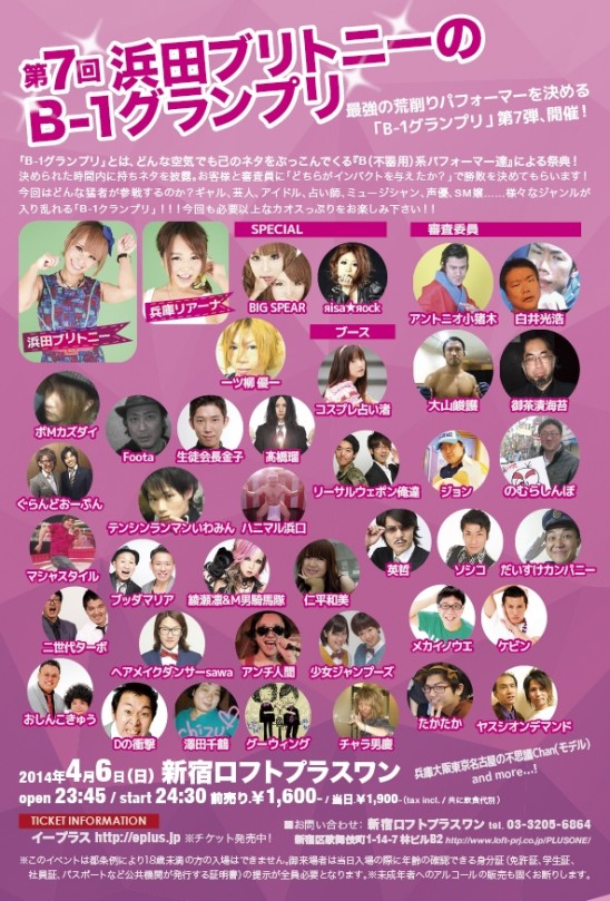 今回はどんな猛者が参戦するのか?ギャル、芸人、アイドル、占い師、ミュージシャン、声優、SM嬢……様々なジャンルが入り乱れる「B-1クランプリ」!!! 今回も必要以上なカオスっぷりをお楽しみ下さい!!
