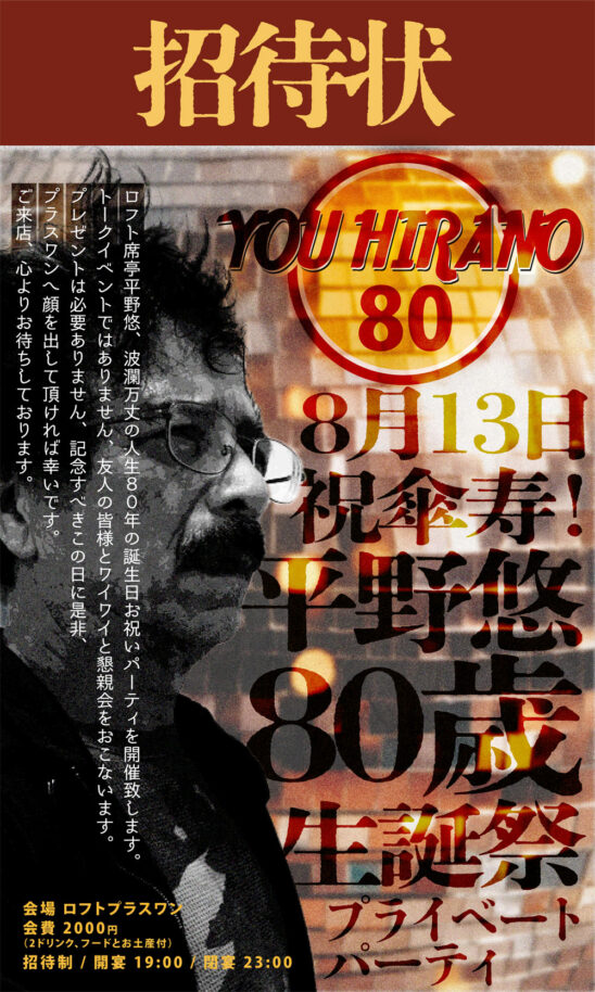 ロフト席亭平野悠、波瀾万丈の人生80年の誕生日お祝いパーティを開催致します。