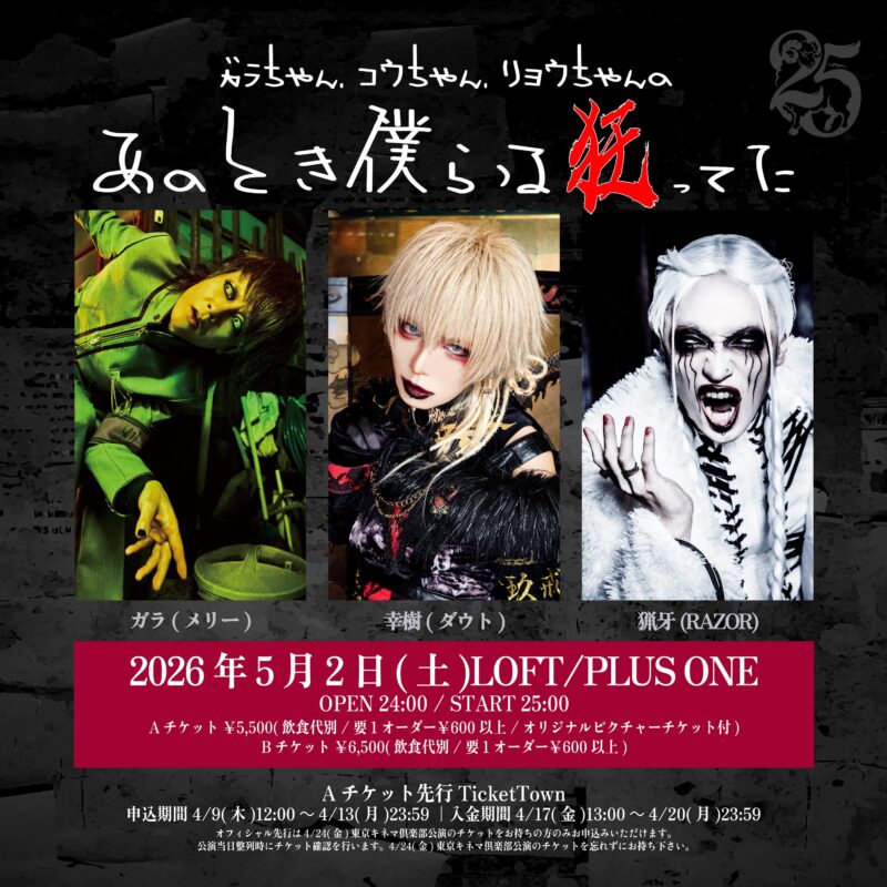 前売¥2,500 / 当日¥3,000 (ともに税込・飲食代別・要1オーダー500円以上)