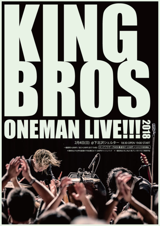 SCHEDULE 2018 02 04 Sunday KING BROTHERS presents 『KING BROTHERS ONEMAN LIVE!!! 2018 』 OPEN 18:30 - START 19:00 Tweet KING BROTHERS TICKETADV¥4000 / DOOR¥4500 【発売日】 11/27〜KING BROTHERS WEB最速先行 12/17〜チケットぴあ・ローソンチケット・e+・SHELTER店頭 Share
