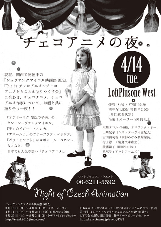 現在、関西で開催中の『シュヴァンクマイエル映画祭2015』、『This is チェコアニメ〜チェコアニメをとことん語りつくす会』に合わせ、チェコアニメ、チェコアニメ作家について、お酒と共に語り合う一夜!!