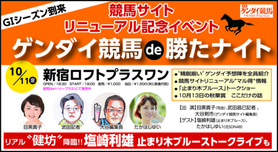 ※イベントタイトルに変更がありました。変更前の仮タイトルは「G1シーズン到来 日刊ゲンダイ競馬でナイト」で、コチラのタイトルのチケットでご入場できます。