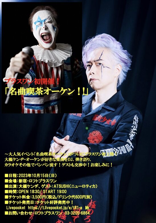 〜大人気イベント「名曲喫茶オーケン」がついにプラスワン初上陸!大槻ケンヂ・オーケンが好きな楽曲をDJ、弾き語り、カラオケその他でバンバン流す!ゲストも交渉中!お楽しみに!