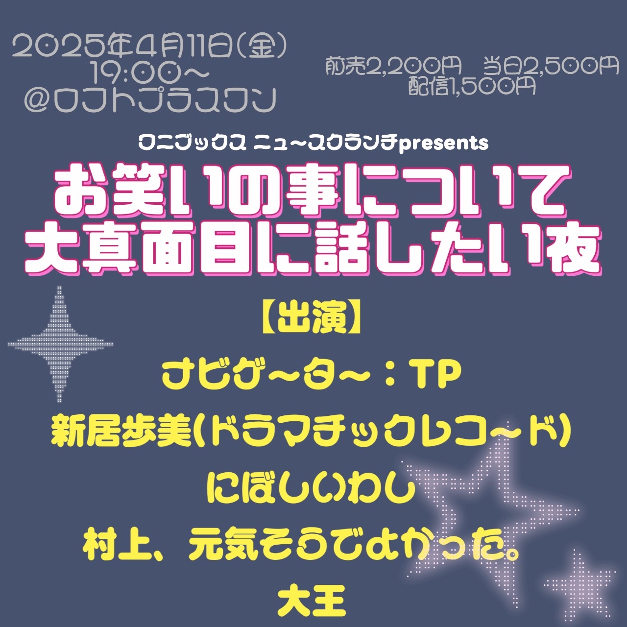 お笑いが好きな人達がお笑いについて話す夜。ナビゲーターは株式会社TPコーポレーション東京X代表取締役の高橋雄作プロデューサー、略して「TP」。