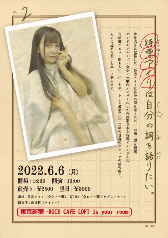 昨年6月配信のトークイベント「待雪アイリは自分の詞を語りたい。」の第2弾をこのたび開催!