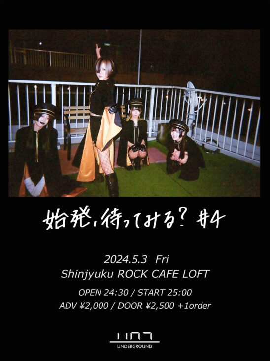 SCHEDULE 2024 05 03 Friday MIDNIGHT EVENT 始発待ちアンダーグラウンドの『始発、待ってみる?♯4』 OPEN 24:30 - START 25:00 Tweet 出演 始発待ちアンダーグラウンド ※状況に応じて出演者の変更、キャンセルになる可能性もございます。ご了承ください。 TICKET《来場チケット》前売り¥2,000(要1オーダー)/当日¥2,500(要1オーダー) 予約は4/20 22:00より受付開始! Share