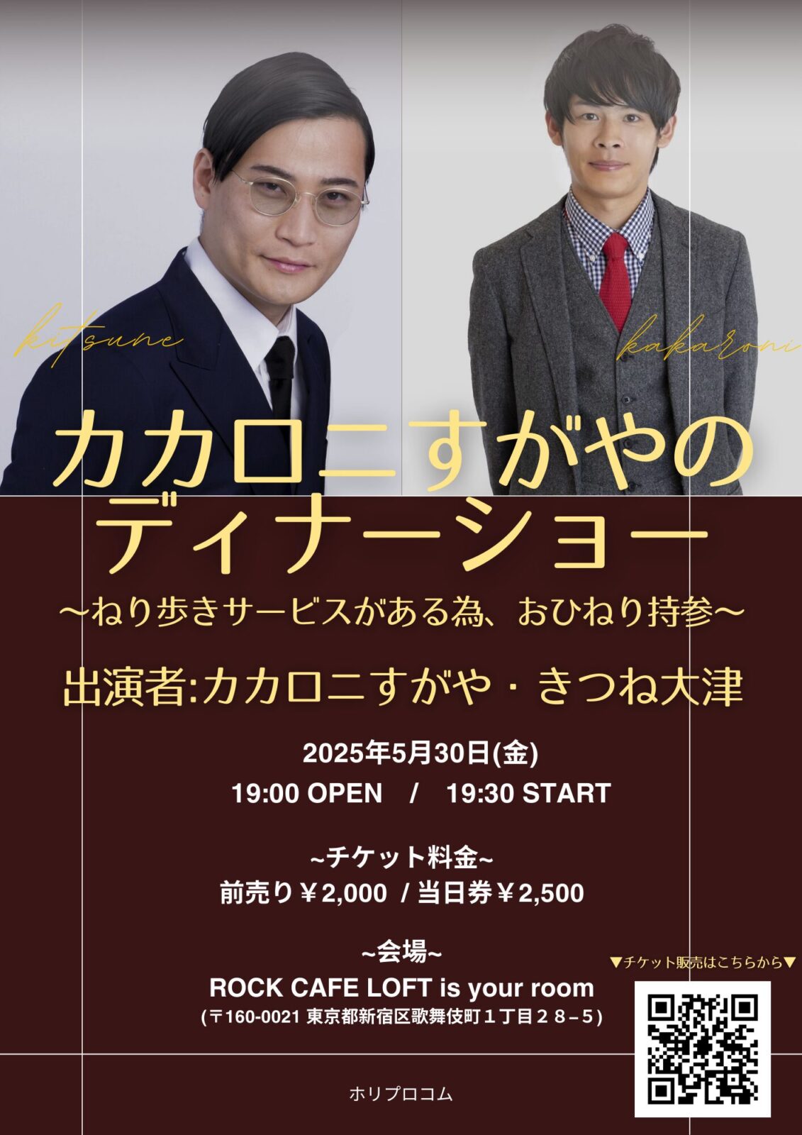 SCHEDULE 2025 05 30 Friday カカロニすがやのディナーショー 〜ねり歩きサービスがある為、おひねり持参〜出演者:カカロニすがや・きつね大津 OPEN 19:00 - START 19:30 Tweet 【出演】 カカロニすがや きつね大津 ※状況に応じて出演者の変更、キャンセルになる可能性もございます。ご了承ください。 TICKET《前売りチケット》¥2,000(要1オーダー)/当日券2,500円(要1オーダー) Peatixにて4/30 12:00より受付開始! #カカロニすがや#きつね大津 Share