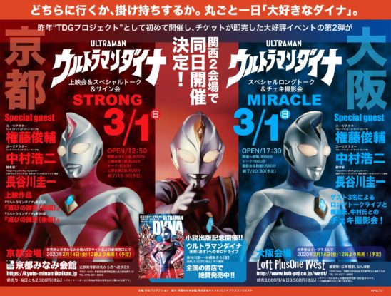 - 日本国内における新型コロナウイルス感染症拡大に伴う日本政府による発表を受け、3 月 1 日(日)に京都・大阪で開催予定のありました『ウルトラマンダイナ』スペシャルト ークイベントの開催中止を決定いたしました。 楽しみにお待ち頂いた皆様には心苦しいばかりですが、ご了承頂けますようお願い申し上げます。