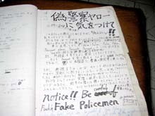▲情報の〜と。このの〜とはどこの安宿にもあって旅の生きた情報が沢山自慢話風に書かれていてこれから未知の土地に行くものにとってとても貴重なものだ。 ここに書かれている「ニセ警官」にはちゃんと私は声をかけられたよ。残念ながら写 真は取り損なった(笑)