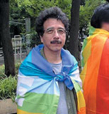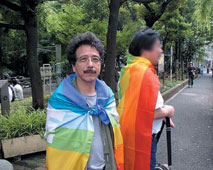 ▲出陣前の平野さん。羽織っているマントは全世界共通「PEACE」の連隊旗だ。ここはゲイのメッカ新宿公園、夜になると全国から集まるゲイ諸氏の「交流の場」になる。一見の価値あり。