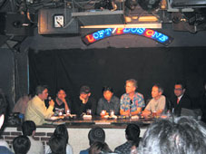 ▲5月4日プラスワンで急遽のシンポジウム。左から〜高見一樹(イースト・ワークス・エンタテインメント)、野田努(「REMIX」スーパーバイザー)、中原昌也(音楽家)、佐々木敦(HEADS代表)、石川真一(輸入盤ディストリビューター・「リバーブ」副社長)、スティーブ・マックルーア(ビルボード誌アジア支局長)、ピーター・バラカン、川内博史(民主党・衆議院議員)みんな真剣だ。