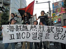 ▲海賊盤熱烈歓迎?おっと、海賊盤ってこっそり買うのが常道ではなかったっけ(笑)ハングル語で屈託がなく書かれているのもいい。公安(警察)にマークされる事もあるので参加者の顔はぼかしました。