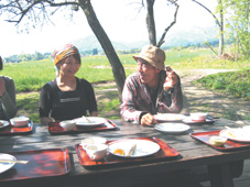 まさに「これでもか〜」って言うくらいの「オーガニック料理」……なんとコーヒーまで大豆から造っているのだ……で会食したあと、夜8時よりラウンジで宿主の臼井さんの「安曇野」の自然のパソコンを使った案内とレクチャーがあり、「今、必要とされているのは”対立”でなく”いいも悪いも混合した共生”が重要で、日本の山河を蘇生するにはデモや抗議運動ではなく、一人一人が自然を愛し、実直に田畑や山の中に入る事が重要なのだ」って言う説明がとても嫌みなく聞こえ、その話しっぷりは「面白宿」特有の主人の話術がまさに芸の域に達している感があった。最後は「明日の朝の農業体験・実習は出来たら全員参加して欲しい」と宣言された。私は「そりゃ〜無理な話だ。朝6時と言ったらわたしゃ、まだ夜中だよ」と断固参加を拒否(笑)。結局私はこの宿に2日間もいたが、ついに朝6時からの農業体験には参加しなかった(笑)。私はこの不思議なファームインに連泊したわけだけれど、やはり私の好奇心は「ここまでパーマカルチャー(雑草や虫を敵としない”ありのまま”に育てる究極の自然農法)にこだわる宿のオヤジ」をもう少しだけ観察、生態調査したくなったからだ。さすがこの不思議なオヤジの観察結果はとてもいい感じだったな。そう「深み」があるんだな。やはり丸2日間もこんな自然の中にいると、いろいろ面白いことが解って来て、帰りには、ここのオヤジ自慢の菜種の油で動く(!)ランドクルーザーに乗せられ、かわゆい女性に見送られて穂高駅に向かった。松本から高速バス(何とも凄いことに1時間に1本出ている−−3500円と値段も安い)で3時間ゆられて新宿に到着して、私の10日間にも及ぶ東京脱出劇は終わった。