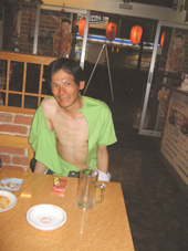 ▲包丁妻の「奴隷」はまちゃん。この日も包丁妻さんに逆らったって言うことで新宿のど真ん中でTシャツビリビリに破かれてしまって私の所に助けを求めに…。 |