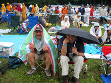 ▲雨のフェス。若いみんなは重装備しているのにわたしゃ、上海シート一枚で防戦。隣は友人のS教授。