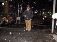 ▲1月某日、深夜。雪のちらつきはじめた井の頭通り、家路を急ぐ親父一人。ポケットの中まで冷たい空気が入り込んでくる。この日の雪は明け方まで降り続いて、翌朝には数cm積もった。顔がほんのり赤らんでいるのは寒さのせい?いや、たぶん雪待ち酒のせいだ。 |