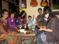 ▲那覇のゲストハウス、月光荘。こうやって、みんなで食事をしている。一番左が確か月光荘の主 |
