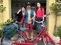 ▲うるま市昆布にあるTOUGH&COCONUTSにて。長期滞在の女の子二人から見送られ出発。いいでしょう(笑)。これがあるから旅人はやめられない |