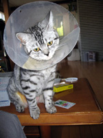 生後9カ月、避妊手術をして戻ってきた。傷口を舐められない様にカラーをしている