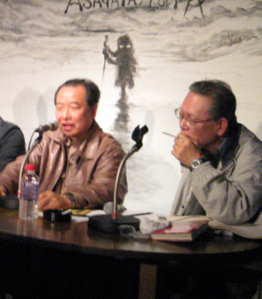 平岡正明さん(左)と元赤軍派議長・塩見孝也氏。阿佐ヶ谷ロフトAの壇上にて