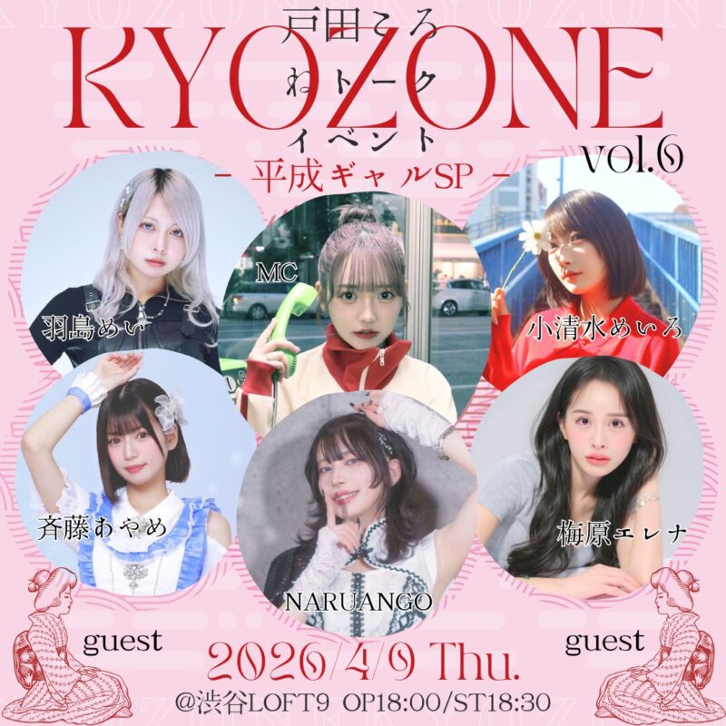 【MC】戸田ころね 【ゲスト】羽島めい、小清水めいろ、梅原エレナ、斉藤あやめ、NARUANGO “アイドル界のトップオブいい奴”戸田ころねのフリートークイベント 『KYOZONE vol.6』 グループを卒業し、戸田ころねソロ主催のKYOZONEは1年半ぶり! アイドルの友達やクリエイターをゲストに呼び、お酒を交えながらSNSでは話せない裏話や、深い話を目の前にいる皆様交えて、ありのままを語り合うフリートークイベント。 今回は、1月に戸田の生誕祭ライブに、SPオープニングユニットとして限定結成したメンバーを再集結! アイドル歴の長い羽島めいを初め、元アイドル小清水めいろ、梅原エレナ。そして現役アイドル1年生の斉藤あやめと、アイドル活動の本音を徹底的に語ります。プライベートでも仲のいいメンバーなので、とってもお酒が進みそうです.....♥(ナルアンゴもこれるといいね.....) トークの他にゲームをしたり、質問に答えたり抽選会をしたりなどファンの皆様とも近い距離で過ごすたっぷり3時間! お酒あり、ご飯ありのアットホームな空間でここでしか聞けない内緒話を是非聞きにきてください♩