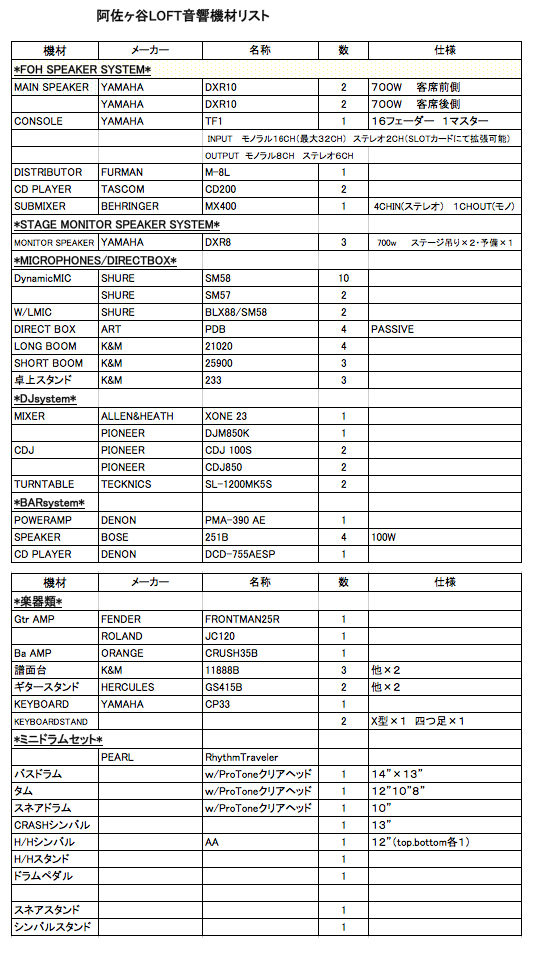 Asagaya/Loft A機材リスト