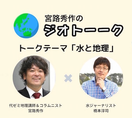 第1回目はゲストに「水ジャーナリスト」の橋本淳司さんをお迎えします。今年はいよいよ東京オリンピックの年。水泳会場の水は大丈夫なのか? そもそも東京の水は? 日本の水は? 世界の水は? など、「水」をテーマにジオトークを繰り広げます。