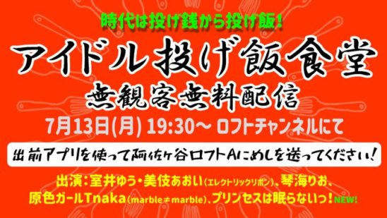 配信での「投げ銭」はもう古い!これからは「投げ飯」だ! UberEatsなどの出前アプリで「支払いは自分で、送り先を他に指定」出来る機能を使った「投げ飯イベント」を実験的に行います。阿佐ヶ谷ロフトAにいるアイドルたちにご飯をください!投げ銭していただいた方にはプレゼントお送りします。