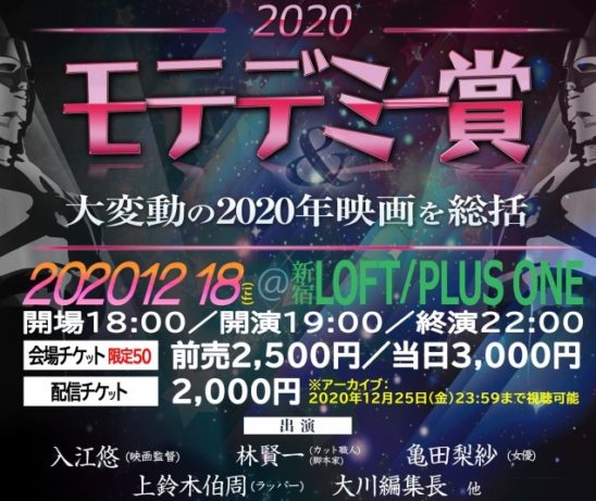 2020年に公開された邦画の中から、モテ作品賞、モテ女優賞、モテ男優賞の各部門を各執筆陣が真剣プレゼン!各賞の結果は、プレゼンに対する観客の拍手+ネット配信のコメントの盛り上がり(?)で決定!