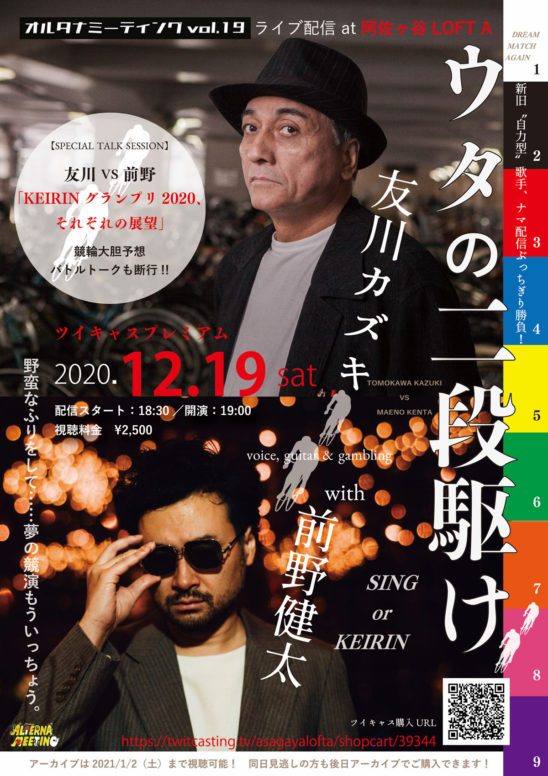 いわゆる「輪友」(=競輪仲間)でもある友川と前野。これまた年末のビッグイベントである「KEIRIN グランプリ2020」の開催(12月30日)を目前に控え、それぞれの「ヨミ」と競輪の醍醐味を縦横に語るトークセッションも配信予定。両者ならではの掛け合いの妙とスリルは、競輪ファンでなくとも一見の価値アリだ。