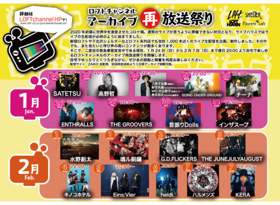 そこで、二度目の緊急事態宣言中である現在、1月24日(日)から2月7日(日)まで連日20:00より自宅で楽しめるロフトチャンネルのアーカイブ再放送祭りを開催します。