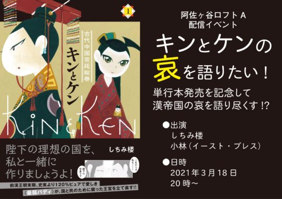 前漢末の宮廷を舞台に、可愛い絵柄でドロドロの政争を描く歴史創作漫画『キンとケン』の単行本第一巻発売を記念して、著者・しちみ楼と担当編集・小林が中国の歴史を振り返りながら阿佐ヶ谷の中心で“哀”を叫ぶーーーー!?