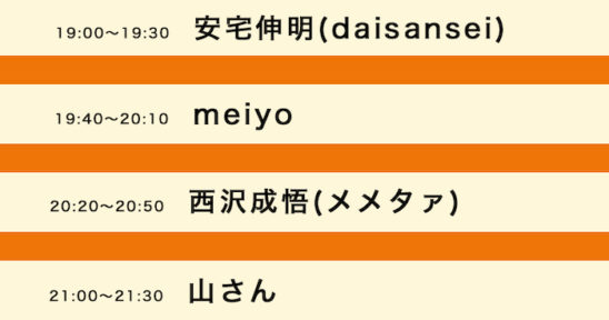 【出演】西沢成悟(メメタァ)/meiyo/安宅伸明(daisansei)/山さん ※五十音表記