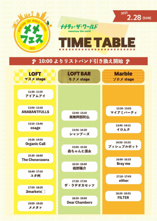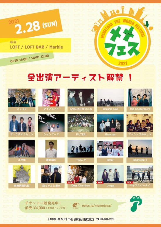 メメタァ / シャンプーズ / Organic Call / FILTER / Bray me / ザ・ラヂオカセッツ / ANABANTFULLS / プッシュプルポット / The Cheserasera / 桃野陽介 / ユタ州 / アイアムアイ / either / イロムク /南無阿部陀仏 / 森ちゃんと須永(The Whoops) / 3markets[ ] / Dear Chambers / osage / マイアミパーティ