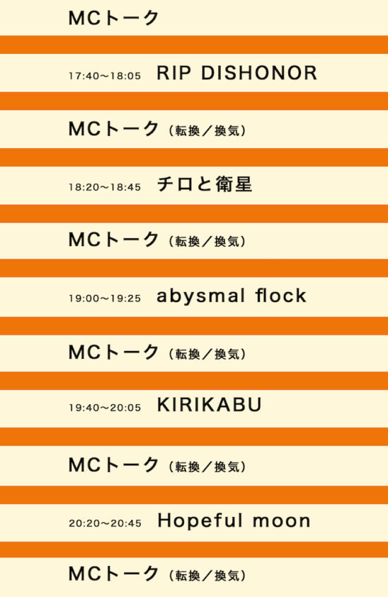 【出演】abysmal flock/KIRIKABU/チロと衛星/Hopeful moon/RIP DISHONOR