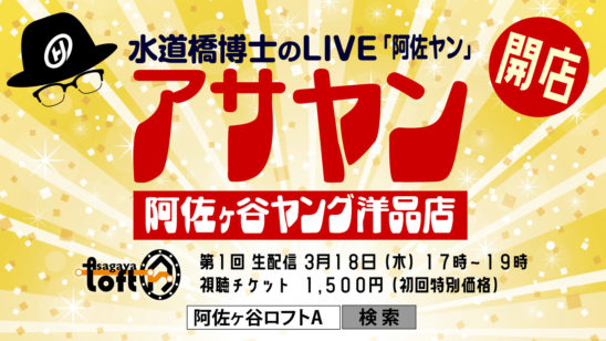 お笑い芸人、浅草キッド・水道橋博士が「アサヤン」の名のもとに新しい時代のお笑いをつくるライブ「阿佐ヶ谷ヤング洋品店」を3/18木曜日に配信致します。