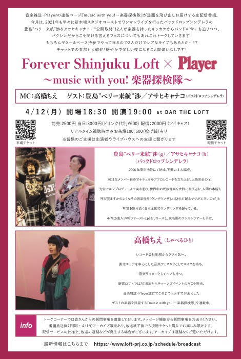 音楽雑誌・Playerの連載ページ『music with you!~楽器探検隊』が誌面を飛び出しお届けする生配信番組。今月は、2021年も早々に新木場スタジオコーストでワンマンライブを行ったバックドロップシンデレラ・豊島”ペリー来航”渉&アサヒキャナコに“公開取材”!