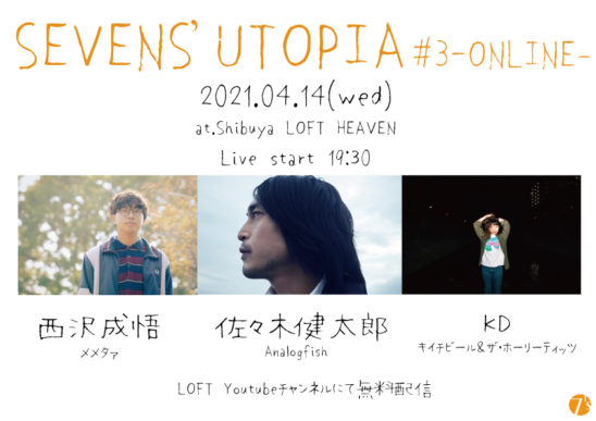 4月14日(水)に開催を予定しております『SEVEN’S UTOPIA#3』@渋谷LOFT HEAVEN公演につきまして、「新型コロナウイルス感染症まん延防止等重点措置」発令に伴う、営業時間の短縮により、お客様にイベントを楽しんで頂く十分な時間が確保出来ないため、無観客での無料配信での開催に変更させて頂きます。