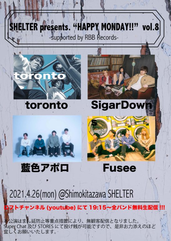 4/26(月)に開催予定の”HAPPY MONDAY” vol.8ですが、まん延防止等重点措置のため通常の開催が難しく、無観客配信で開催する運びとなりました。