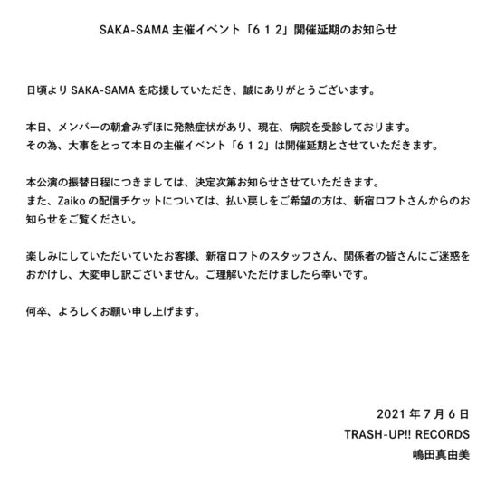 【開催延期】SAKA-SAMA主催ライブ「6 1 2」