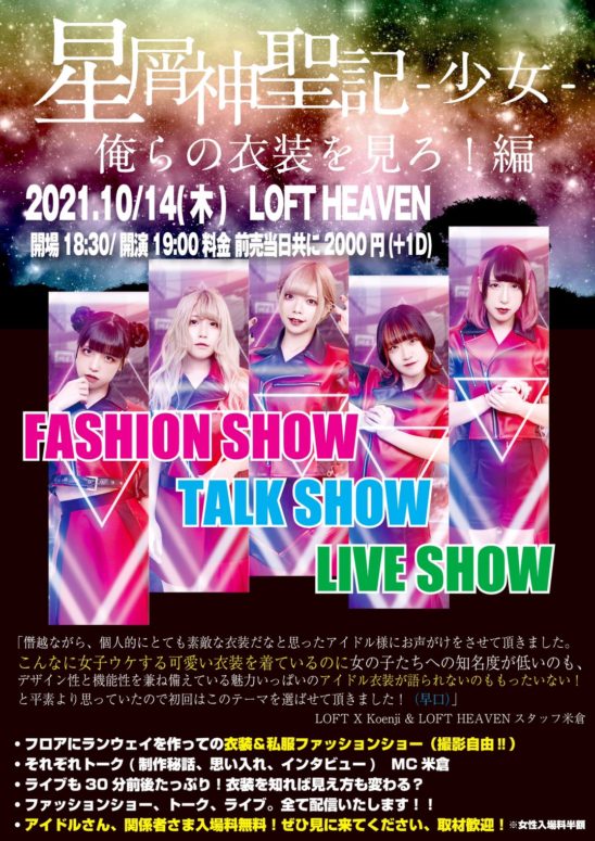 僭越ながら、個人的にとても素敵な衣装だなと思ったアイドル様にお声がけをさせて頂きました。こんなに女子ウケする可愛い衣装を着ているのに女の子たちへの知名度が低いのも、デザイン性と機能性を兼ね備えている魅力いっぱいのアイドル衣装が語られないのはもったいない!と平素より思っていたので初回はこのテーマを選ばせて頂きました!(LOFT HEAVENスタッフ 米倉)